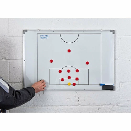 Magnetic. Ideal for use in the dressing room. Full pitch on one side, set play half pitch on the other. Bump-proof rubber corners. Hanging hooks. 2 x dry-wipe marker pens. 27 x 3 cm magnets. Foam eraser. Carry bag.