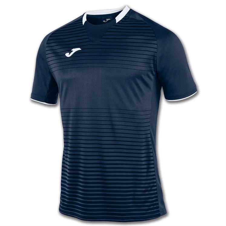 Round neck with added rib knit on collar for optimal fit. Sublimated horizontal stripe print design on the front with space for adding sponsor logos. Joma logo on right chest