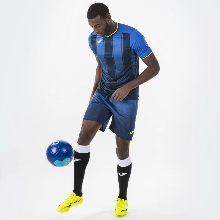 T-shirt made of polyester with sublimation and vertical degraded stripes. Incorporates Micro-Mesh technology on the sides and underarms to improve breathability. V-neck including elastic ribbing at the front and cuffs. Shorts designed in polyester with degraded sublimation print. The waist is elastic and features a drawstring for a perfect fit. With DRY MX, a technology capable of controlling the sportsperson’s perspiration.